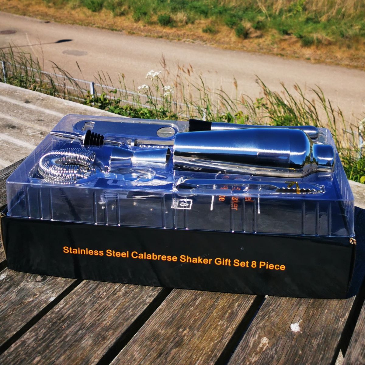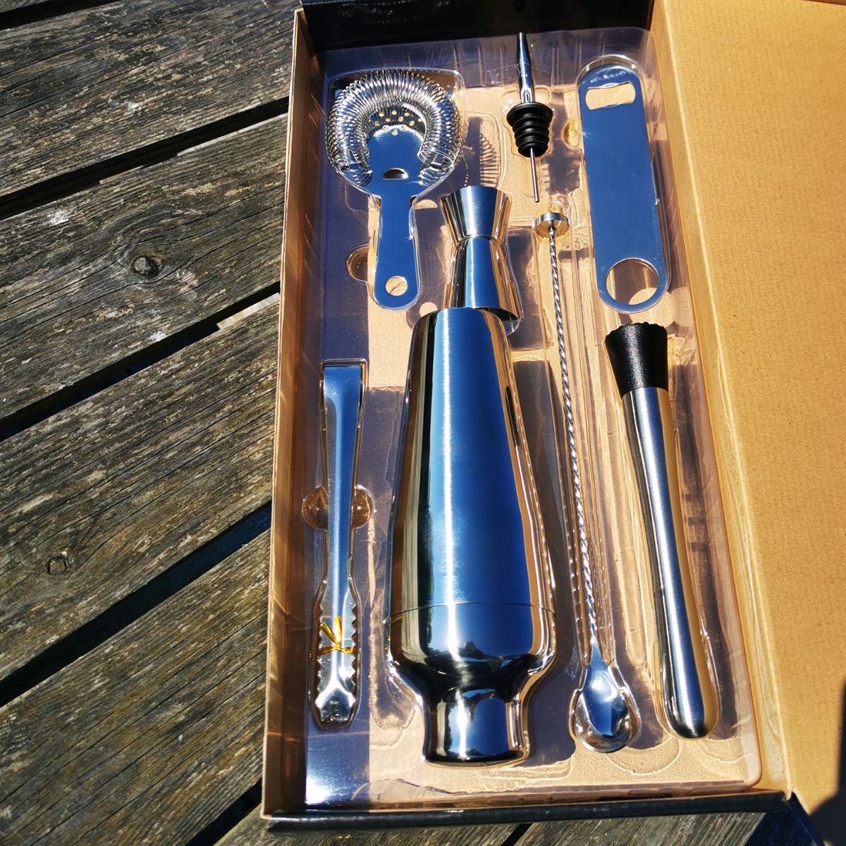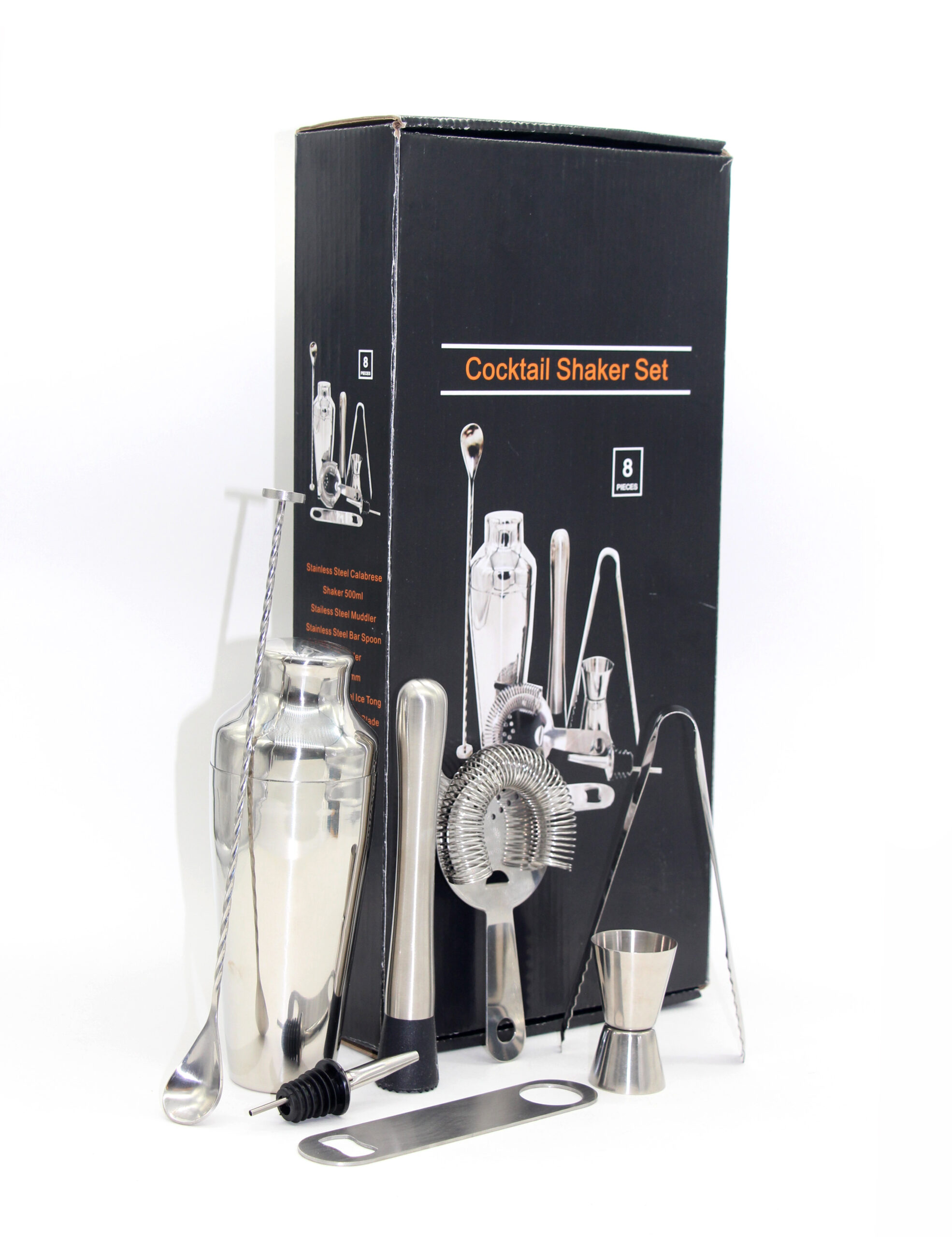 Tento kompaktní barový set z nerezové oceli obsahuje nezbytné nástroje pro míchání profesionálních koktejlů doma. Set zahrnuje koktejlový shaker, sítko, barovou lžičku na míchání, drtič na rozmačkání ingrediencí, kleště na led, dvojitý odměrný pohárek (25/50 ml), Hawthorne sítko na filtrování a otvírák na lahve.